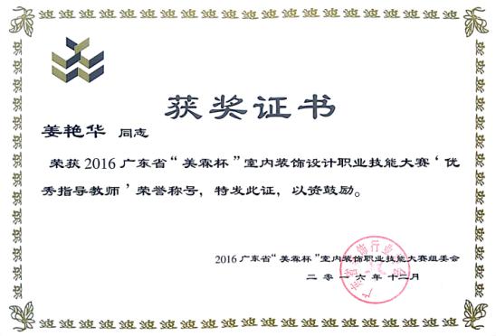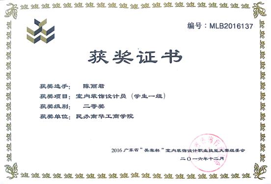 近日,由广东省人力资源和社会保障厅、广东省工业工会联合发起,由广东省装饰职业技能鉴定所主办的省级技能大赛“美霖杯”手绘设计大赛评审结果公布,我校建艺学院14级建装二班徐丽英、陈丽君两位同学分别参加住宅、酒店两个项目的限时空间设计,获得2016年广东省二等奖。同时,作为奖励由广东省人力资源和社会保障厅、广东省装饰职业技能鉴定中心对二位同学颁发室内装饰设计员三级职业资格证书。两位指导老师郭玉山、姜艳华也分别获得“优秀指导教师奖”。