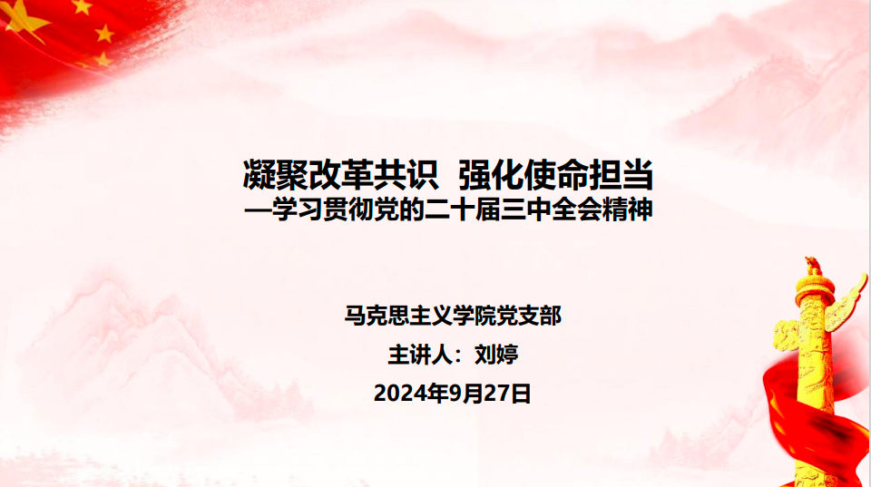 为深入学习贯彻党的二十届三中全会精神,深刻学习领会习近平总书记关于全面深化改革的一系列新思想、新观点、新论断。9月27日下午,马克思主义学院党支部刘婷书记向全院教师开展了以《凝聚改革共识 强化使命担当》为主题的专题党课。