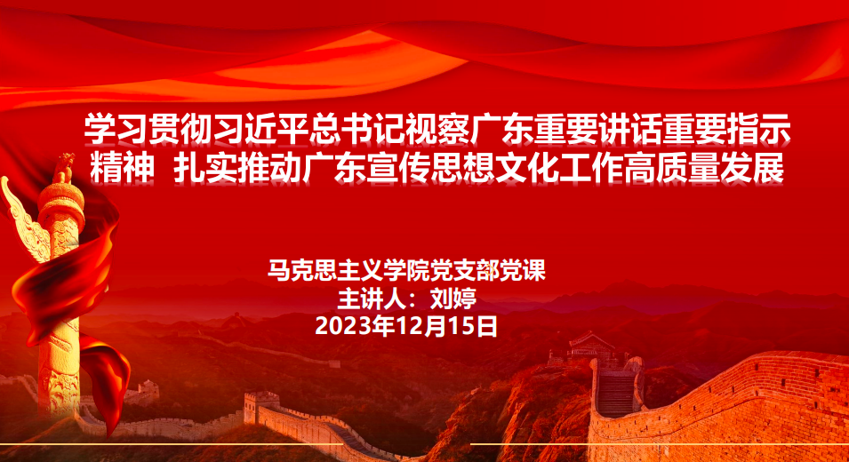 本次党课的主题为“学习贯彻习近平总书记视察广东重要讲话重要指示精神,扎实推动广东宣传思想文化工作高质量发展”。刘婷书记首先指出:在全国上下全面贯彻党的二十大精神的开局之年,习近平总书记亲临广东视察,先后到湛江、茂名、广州等地调研指导,同法国总统马克龙在广州非正式会晤,这是广东发展历程中具有里程碑意义的大事,对于全面建设社会主义现代化国家开好局起好步具有重要意义。刘婷书记说,习近平总书记的广东行,从其间的三个关键词,即深化改革开放、高质量发展、大兴调查研究,可以深刻领会习近平总书记广东考察调研的深意:深化改革开放,再次宣示决心;高质量发展,中国式现代化本质要求;大兴调查研究,破题之道未变。可以说,习近平总书记的重要讲话精神,又一次在广东改革发展的关键时刻和重要关口,为广东把脉定向、掌舵领航,为广东高质量发展注入强大动力。接着,刘婷书记为大家阐释了中国式现代化广东实践的新部署,即“1310”新部署—广东的新航标。最后,刘婷书记还指出在新时代新征程、高质量发展之下,推动广东宣传思想文化工作高质量发展至关重要。省委书记黄坤明分析指出当前广东宣传思想文化工作面临着四个“任务更重、要求更高”,提出六个“高”。这就要求广东,要立足大局大势,深刻把握宣传思想文化工作面临的新形势新要求,以新担当新作为扎实推进文化强省建设,更好发挥文化引领风尚、 教育人民、服务社会、推动发展的作用。
