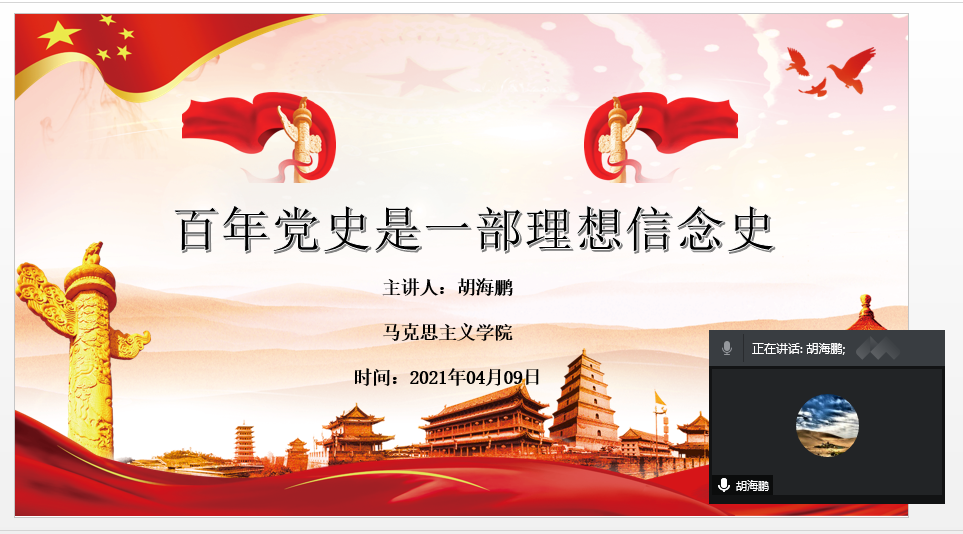 2021年4月9日下午,在全党集中开展党史学习教育这样一个重要节点,马克思主义学院党支部围绕“党史”开展主题党课教育活动。支部胡海鹏书记以“百年党史是一部理想信念史”为主题,为马克思主义学院全体党员上了一堂内容丰富、寓意深刻的党课。
