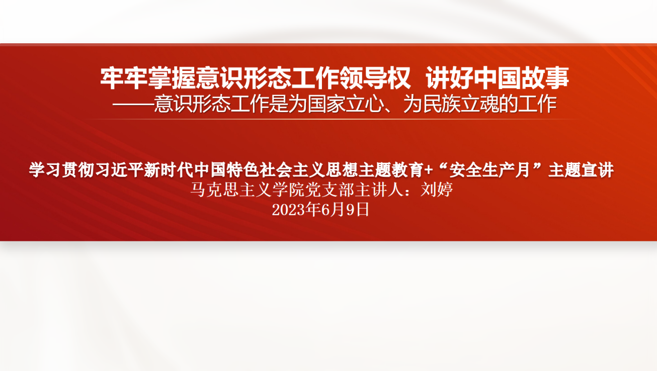 6月9日下午,马克思主义学院党支部在天河校区综合楼805室开展主题党课+“安全生产月”宣讲主题党日活动,全体党员教师参与了本次活动。本次活动分两个环节进行。第一个环节,马克思主义学院党支部书记刘婷以“牢牢掌握意识形态工作领导权 讲好中国故事”为题,为马院教师上了一堂主题鲜明、内涵丰富、意义深刻的主题党课。刘婷书记以习近平总书记在2013年8月19日全国宣传思想工作会议上的重要讲话导入该主题党课,例举了西方颜...