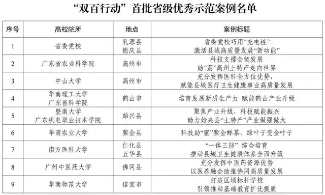 为贯彻落实省委“1310”具体部署和实施“百千万工程”部署要求,总结推广高校院所助力“百千万工程”的典型经验和创新做法,加强示范引领,广东省“百千万工程”指挥部办公室、中共广东省委教育工委、广东省教育厅组织开展了“双百行动”优秀项目案例征集和评选工作,经过各校申报、材料审核、专家评选等环节,按照创新性、实效性、典型性等标准,共遴选出28 个“双百行动”首批优秀示范案例。