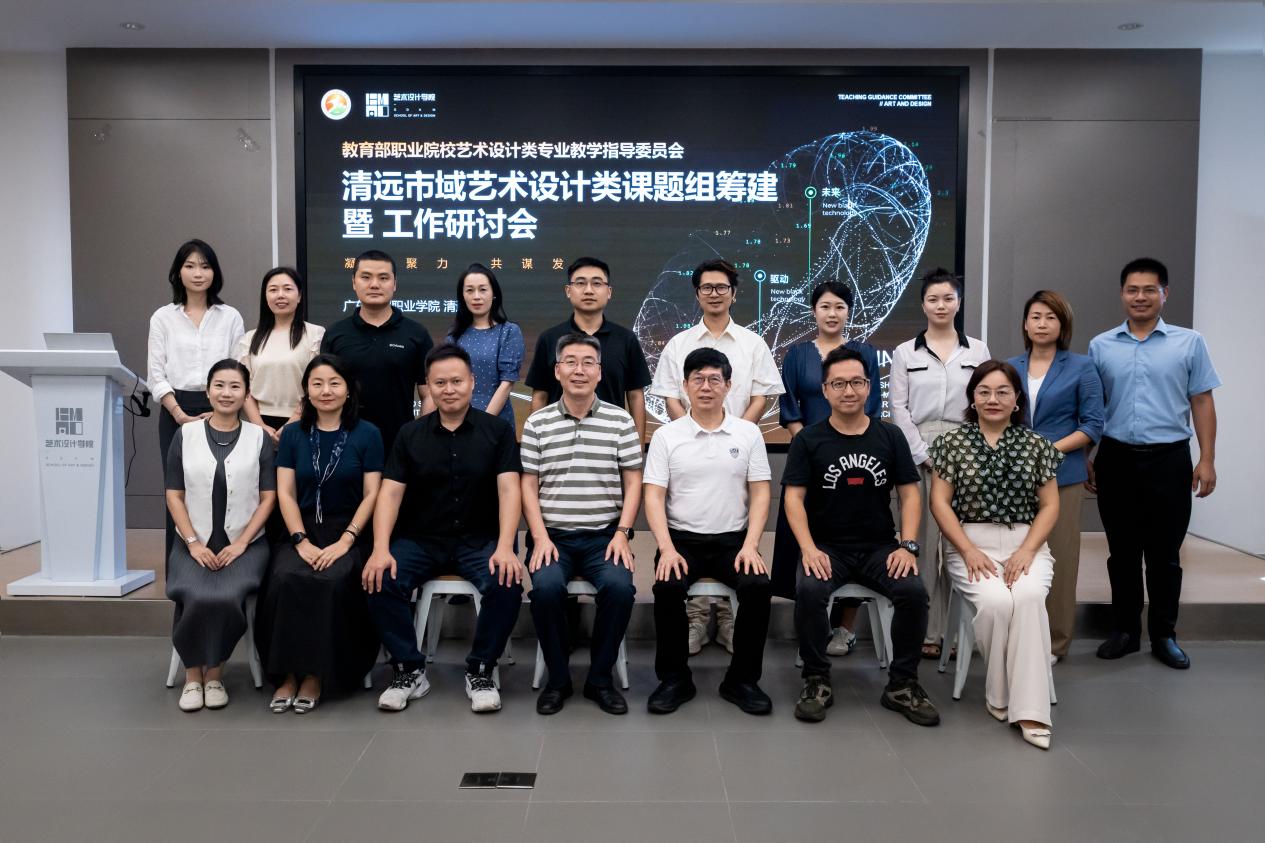 会议最后,全体参会人员合影留念。此次研讨会的成功召开,标志着清远市域艺术设计类课题组筹建工作正式启动,为广东科贸职业学院艺术设计学院深化产教融合、联动政校企行资源搭建了关键平台。未来,学院将以课题组为纽带,持续推进教育教学改革与成果转化,为区域艺术设计产业高质量发展注入新动能。