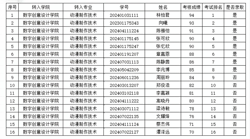 根据《关于开展2024 级在校生转专业工作的通知》和《数字创意设计学院24级转专业接收计划》的规定和要求,现对24级动漫制作技术专业转专业考核成绩结果公示: