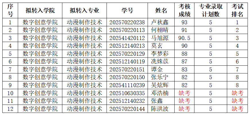 根据《关于开展2025级在校生转专业工作的通知》和《数字创意学院25级转专业接收计划》的规定和要求,现对25级动漫制作技术专业转专业考核成绩结果公示: