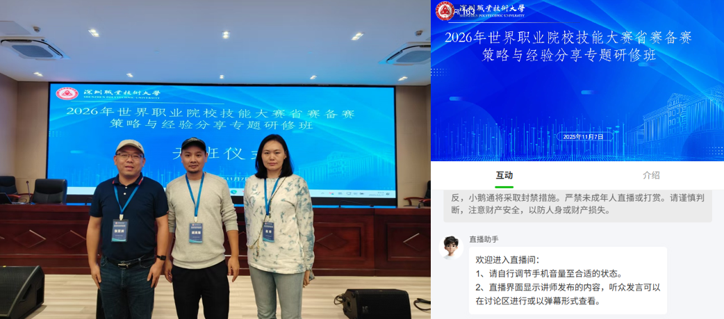 11月7日至9日,动漫制作技术专业胡高瑞老师、数字媒体技术专业吴秋琅老师和艺术设计专业张亚洲老师、陈晓华老师、蒋婷老师参加了在深圳职业技术大学举办的“2026 年世界职业院校技能大赛省赛备赛策略与经验分享专题研修班”。备赛研修内容丰富且针对性极强,既包含对世校赛最新规程与制度要求的深度解读,以及大赛 “真场景、真问题、真技能、真方案” 设计理念的专业解析,帮助指导教师精准把握政策导向与赛事趋势。同时邀请2025年世校赛获奖团队指导教师分享在团队组建、训练规划、心理调适、资源利用等方面的成功经验,并通过剖析获奖案例共同特点提供切实可行的备赛思路,全方位助力参赛团队提升备赛质量与竞争力。