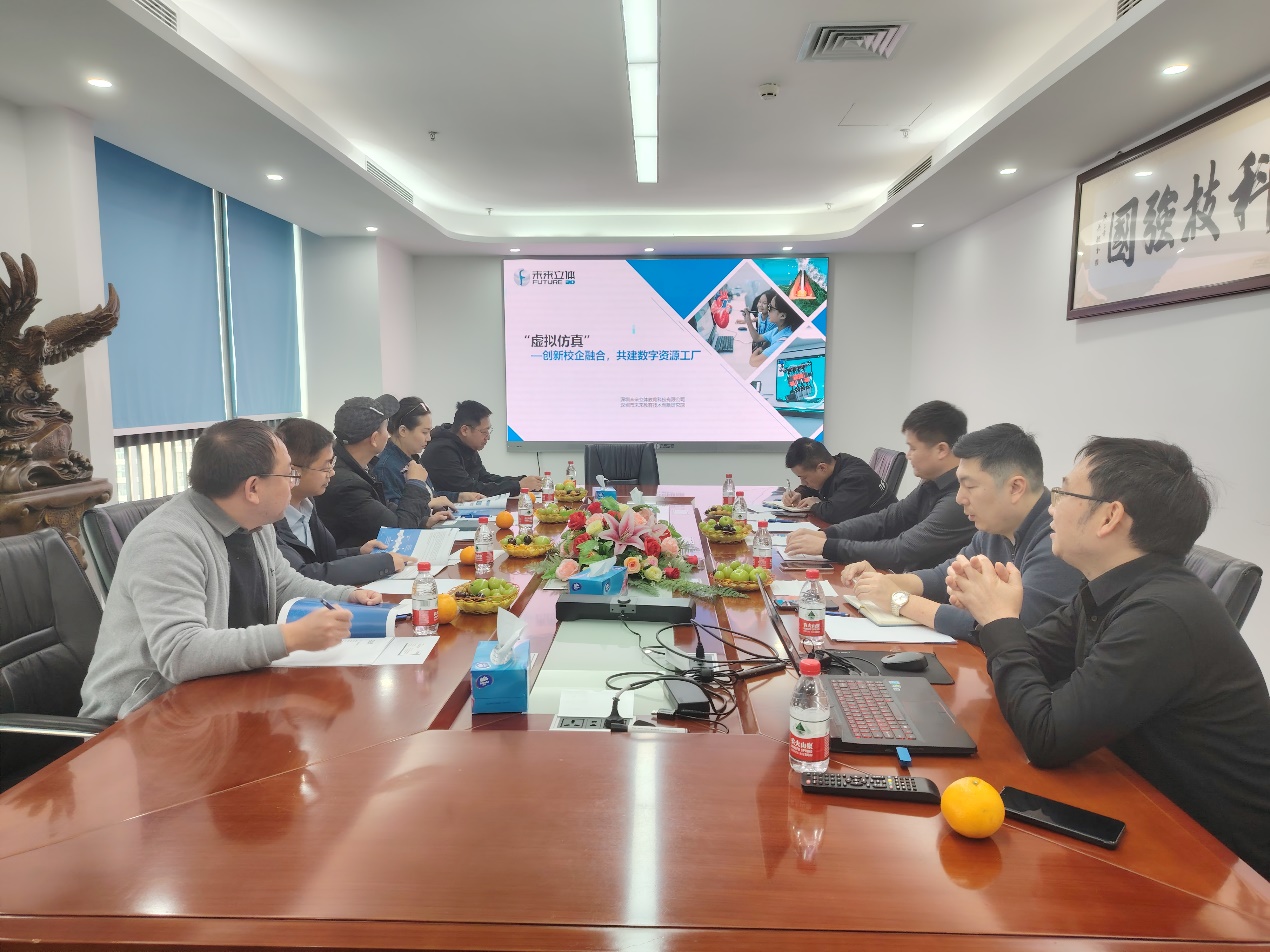 此次调研的第一站是深圳未来立体教育科技有限公司。该公司在教育科技领域有着独特的技术和理念,其业务涉及数字化教育资源的开发、三维技术应用等。调研组与公司管理人员和技术骨干进行了深入交流,了解对数字创意设计人才在 3D技术、虚拟现实(VR)、增强现实(AR)等新兴技术领域对人才需求的应用能力,期望能够招聘到既熟悉教育教学规律又掌握前沿数字技术的复合型人才,以推动公司在教育科技领域的创新发展。