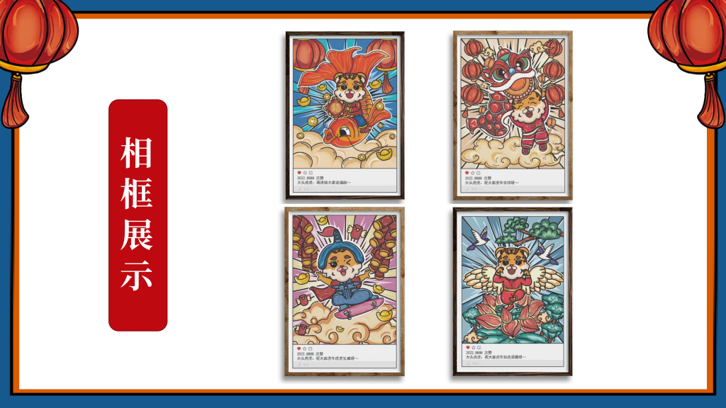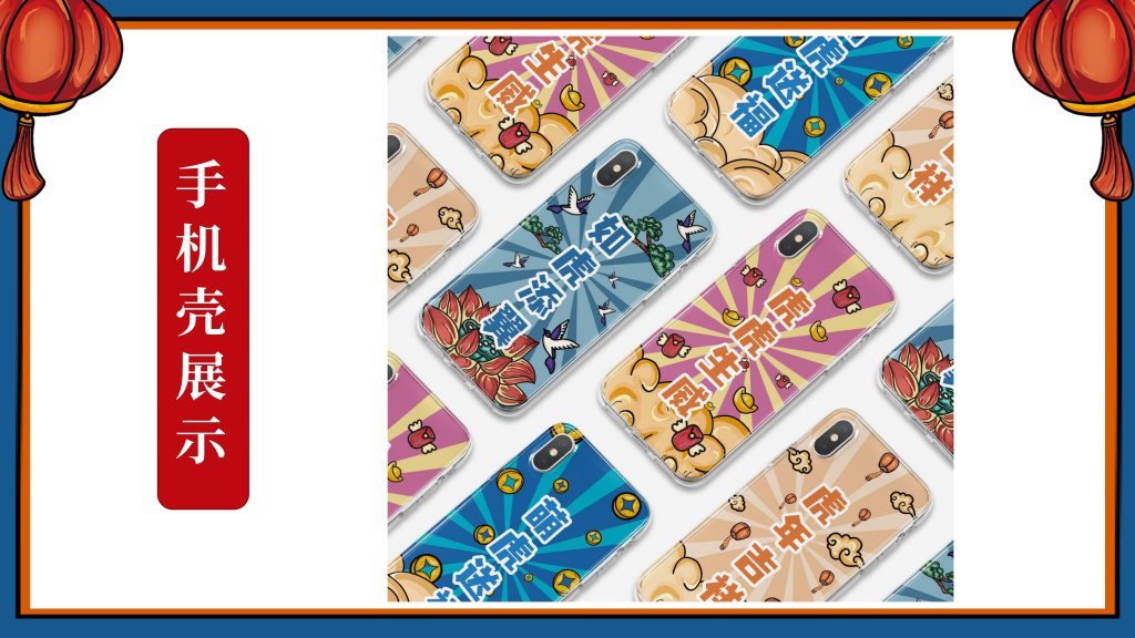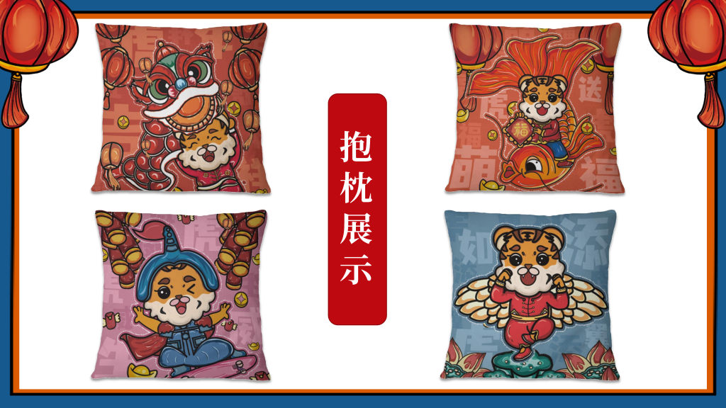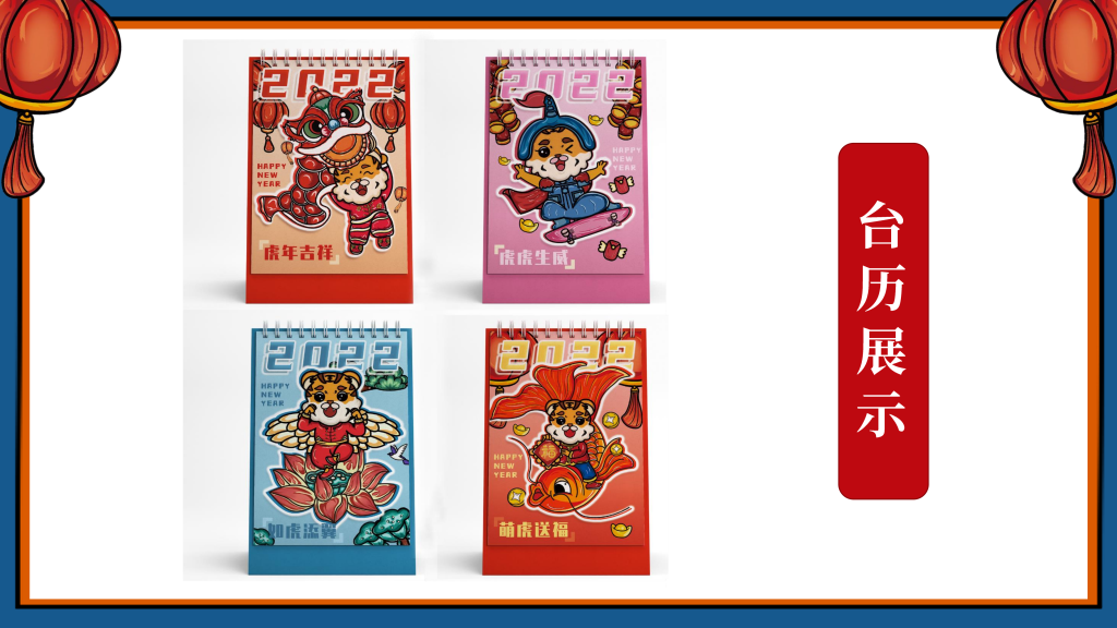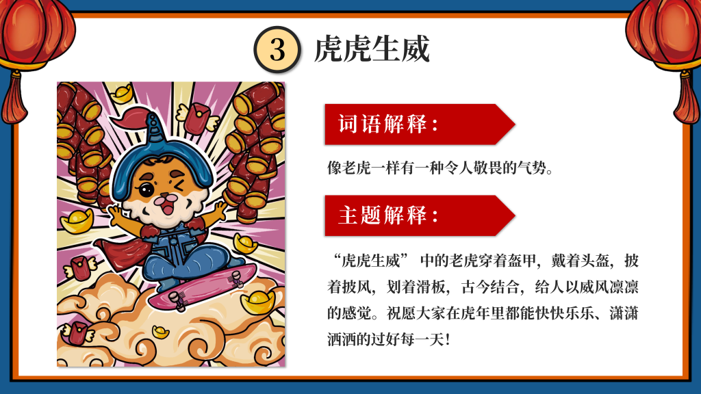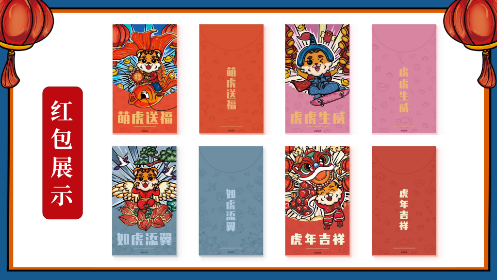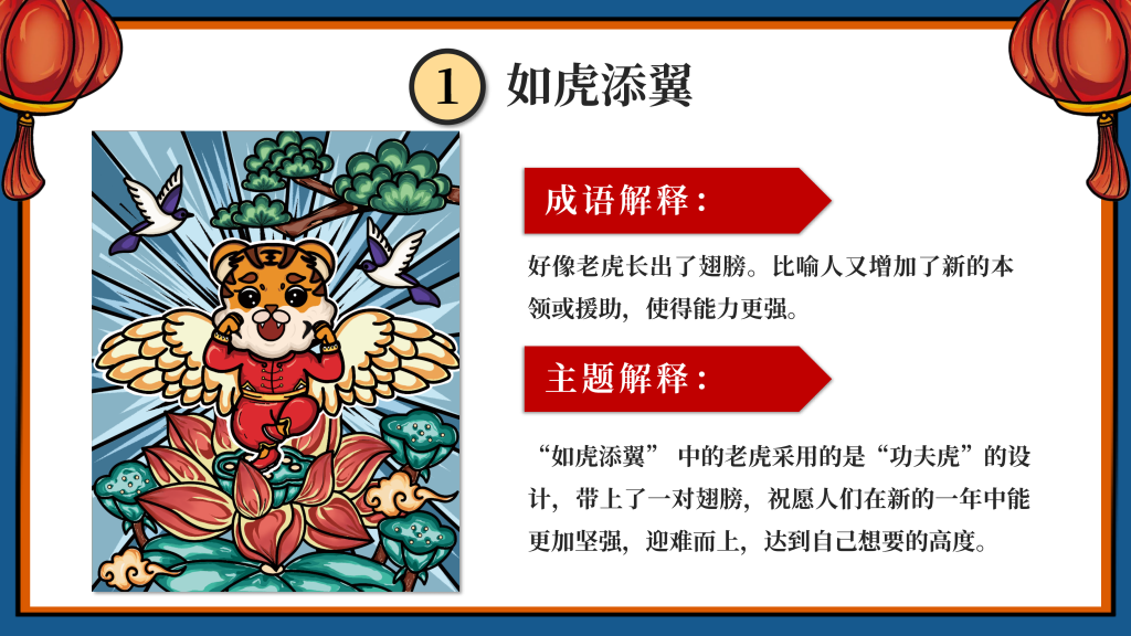 我们采用了国潮的设计风格,以“新年”为主题,设计了一只有趣的“虎”IP形象,挑选了4个的带“虎”字的有美好寓意的成语作为插画的主题组成一系列插画,即:如虎添翼、虎虎生威、虎年吉祥、萌虎送福,用中国传统的吉祥美好象征寓意的元素,搭配丰富的色彩+双重阴影,使画面更加丰富,通过大胆的配色,新颖的方式表现“新年”,传递“喜庆”。