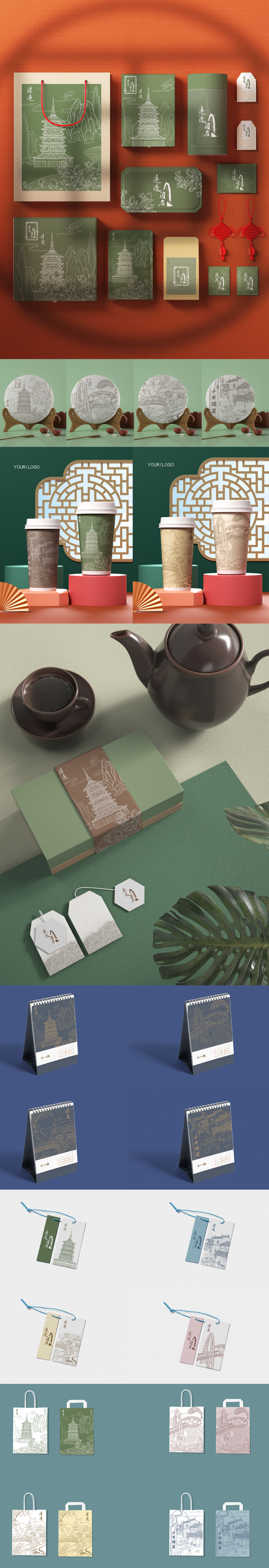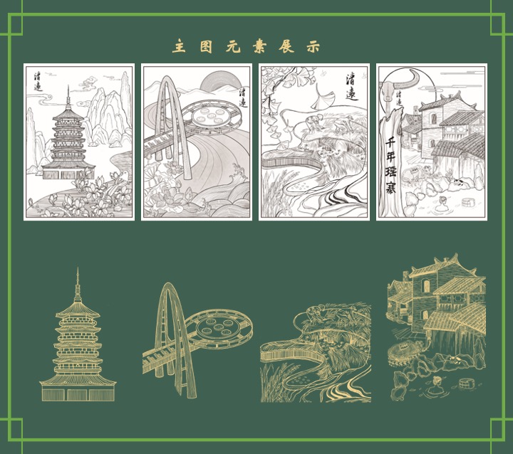设计说明:清远的名字,最早出现于南北朝时期,取清波流远之意,远近相接之名。清远有历史悠久的文化底蕴,春花、秋月、夏日、冬雪,不同的季节有不同的美,隐藏在莽莽的群山之中的古老漂流与温泉,让你远离城市樊笼的千年瑶寨,又或者是那相传盛久的古塔,四季更迭,花开花落,我们所感受的清远四季的不同。我们设计的灵感是结合清远景点的四季,将清远市地域“文化特色”和“旅游景点”结合季节充分融入清远当地传统文化,展现清远地域特色,让传统文化与现代文明相融合。