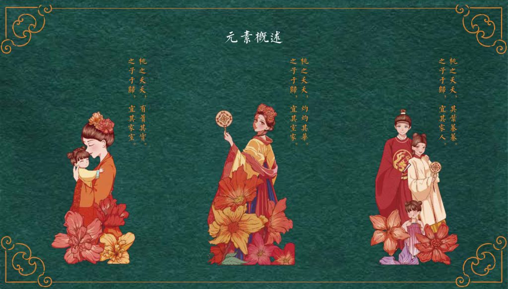 《桃夭》用优美凝炼的字句揭示了新嫁娘与家人和睦相处的美好品德,也写出了她的美好品德给新建的家庭注入新鲜的血液,带来和谐欢乐的气氛,非常适合用来作为对新婚夫妇的祝福。设计者将诗经中的优美字句用插画的形式表现出来,从字体设计、颜色选择、元素提取、绘制手法等方面结合现代感和古朴的中国传统风格,形成极具视觉美感的图形,并运用在婚礼中会使用的各类物品上,形成风格统一、视觉强烈的整体设计。
