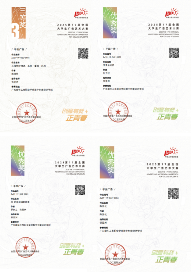 2025年第17届全国大学生广告艺术大赛获奖名单公布,数创学院艺术设计专业学生表现突出,在指导教师张亚洲老师的指导下喜获多项全国与省级荣誉。其中,2023级艺术设计专业学生陈俊希的作品荣获全国三等奖;刘子欣、陈洁仪以及罗创立、陈品伊的作品分别获得全国优秀奖,该成绩的取得体现了艺术设计专业学生在广告创意与视觉表达方面的能力水平。