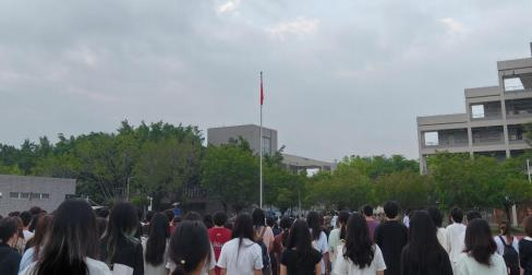 晨光启幕,凝聚初心,国旗护卫队踏着铿锵正步护送国旗入场,随着雄壮的《义勇军进行曲》响起,擎旗手振臂扬旗,五星红旗冉冉升起。全体师生肃立行注目礼,齐声高唱国歌,嘹亮歌声响彻校园。