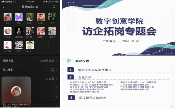 本次活动聚焦文化创意与数字科技领域,学院先后与宇宙元文化科技(广东)有限公司、宇宙元文化知识(广东)有限公司、科幻现实(广州)高校技术产业有限公司、广东善舍影视投资有限公司、举个例子(广州)文化创意有限公司、广州智瞳畅想文化科技有限公司等9家企业开展了深入交流。各企业负责人分别介绍了公司业务范围、人才岗位需求及未来发展规划,并表达了与 数字创意学院共建实习基地、开展项目合作、协同育人的强烈意愿。