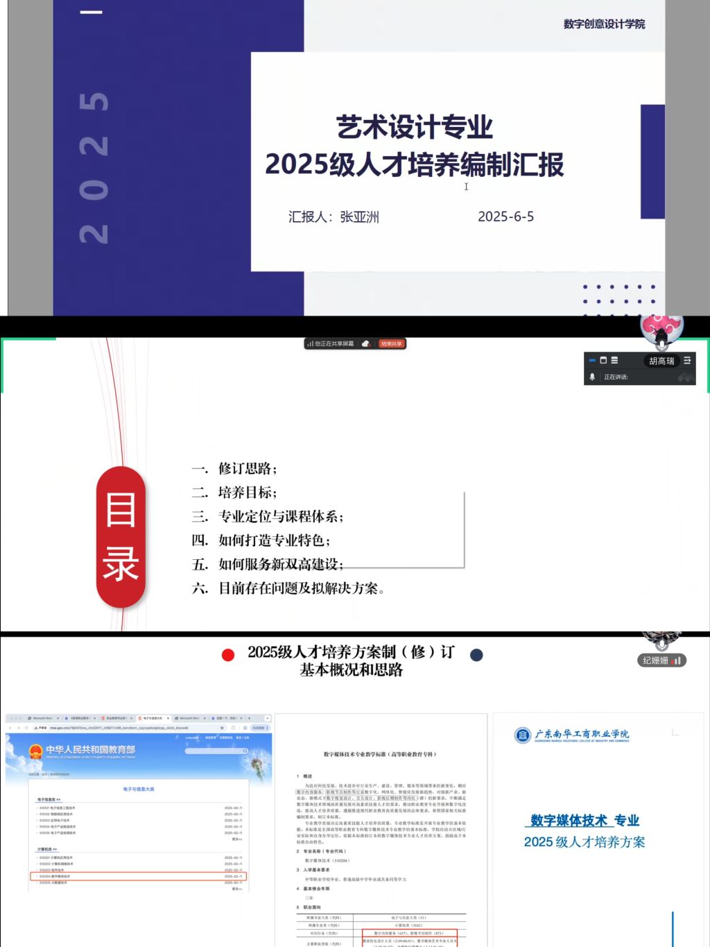本次论证会采取“专业汇报+专家点评”的形式进行,包含2025级艺术设计人才培养方案、2025级动漫制作技术人才培养方案、2025级数字媒体技术人才培养方案论证。会上,各专业主任对我院2025级人才培养方案在专业调研、人才培养模式、课程体系构建、培养特色等方面逐一进行了汇报。