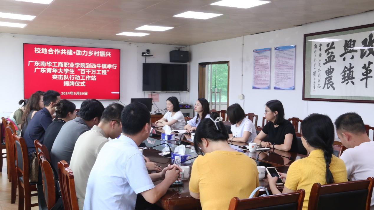 5月30日下午,广东青年大学生“百千万工程”突击队广东南华工商职业学院•西牛工作站正式揭牌!西牛镇党委委员余楚君,西牛镇副镇长、镇团委书记李小凤,西牛镇党建办副主任、乡村振兴人才驿站负责人陆诗雯,广东南华工商职业学院学生处、校团委以及“百千万工程”突击队行动队伍师生代表参加仪式。