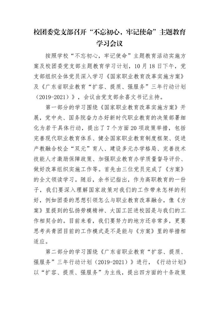 校团委党支部召开“不忘初心,牢记使命”主题教育学习会议