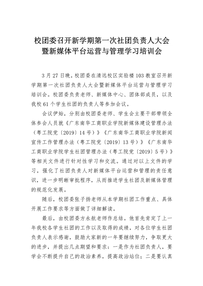 校团委召开新学期第一次社团负责人大会暨新媒体平台运营与管理学习培训会
