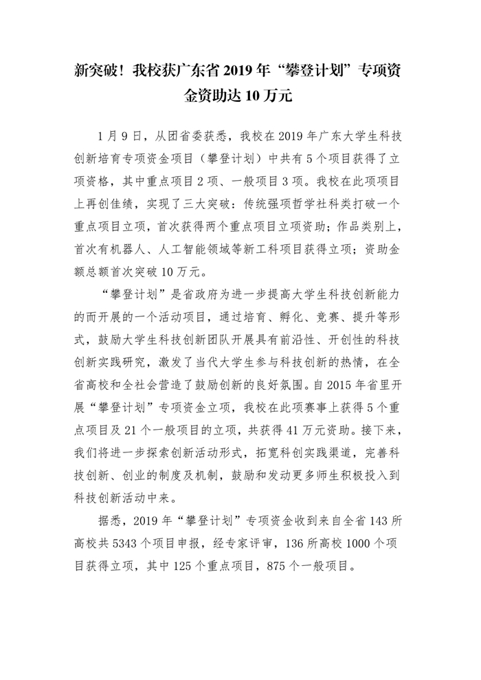 新突破!我校获广东省2019年“攀登计划”专项资金资助达10万元