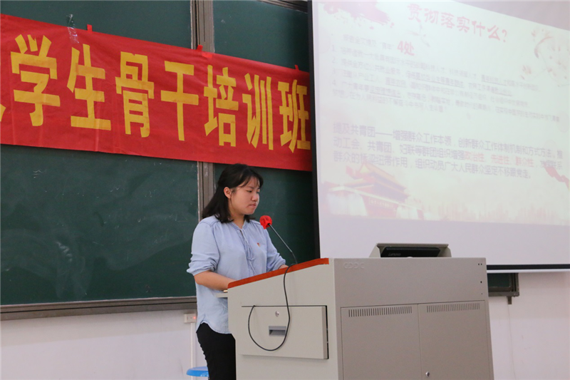黄老师首先跟学员们分享了自己多年的共青团工作经历,用亲身经历告诉学员们共青团工作对她学习、生活等方面产生的积极影响。随后,与全体学员共同学习习近平总书记考察北大在师生座谈会上发表重要讲话时对青年学生提出的“爱国、励志、求真、力行”八字箴言。黄老师认为“爱”应该是要有大局意识的爱,热爱祖国、热爱人民、热爱工作、热爱生活;“励志”则要求我们做一个有梦想的人,积极去圆梦,实现自我价值;“求真”则要求我们学好专业知识和本领,用科学的头脑武装自己;“力行”则要求我们做到知行合一,真正做到脚踏实地、勇担重任、敢为人先,以“爱国、励志、求真、力行”要求自己。紧接着,黄老师深入浅出地讲解了她对学习十九大报告精神的理解,主要从三个方面展开:一是十九大讲了什么;二是十九大贯彻落实了什么;三是如何贯彻落实。最后嘱咐青马学员要坚定理想信念,做马克思主义的坚定拥护者;要坚定不移跟党走,用实际行动感化身边的青年,传播正能量;要勇于奋斗,奋斗的青春最美丽;做事要有耐心、细心和恒心,要关心身边小事,热心公益服务。