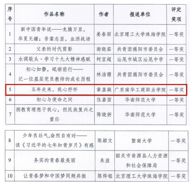 近日,团省委公布了“不忘初心 牢记使命”广东共青团十九大精神学习心得征文活动评选结果,团员青年组共评选出61篇优秀文章,我校3名共青团员的征文获得奖项。其中,应用法学与公共事业学院2017级法检助班章盈凝《五年走来,我心抒怀》获一等奖,财务金融学院2016级注册会计师一班杨舒雅《仰望》获三等奖,应用法学与公共事业学院2016级文秘班林淑芬《持初心 促成长》获三等奖。在本次活动中,参与活动的包括各政府机关、大中专学校的团员青年,最高奖项一等奖仅有10名,我校是全省高职院中唯一一个。