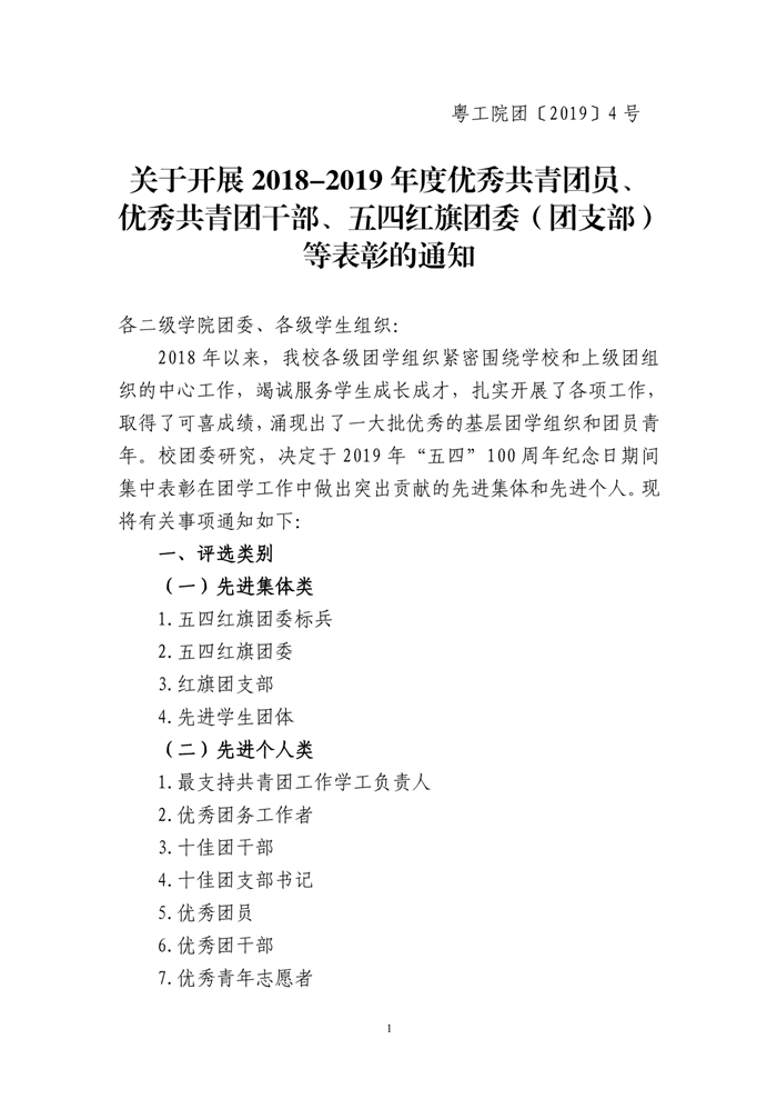 关于开展2018—2019年度优秀共青团员、优秀共青团干部、五四红旗团委(团支部)等表彰的通知