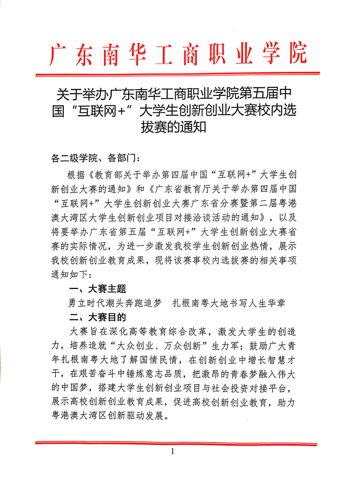 关于举办广东南华工商职业学院第五届中国“互联网+” 大学生创新创业大赛校内选拔赛的通知