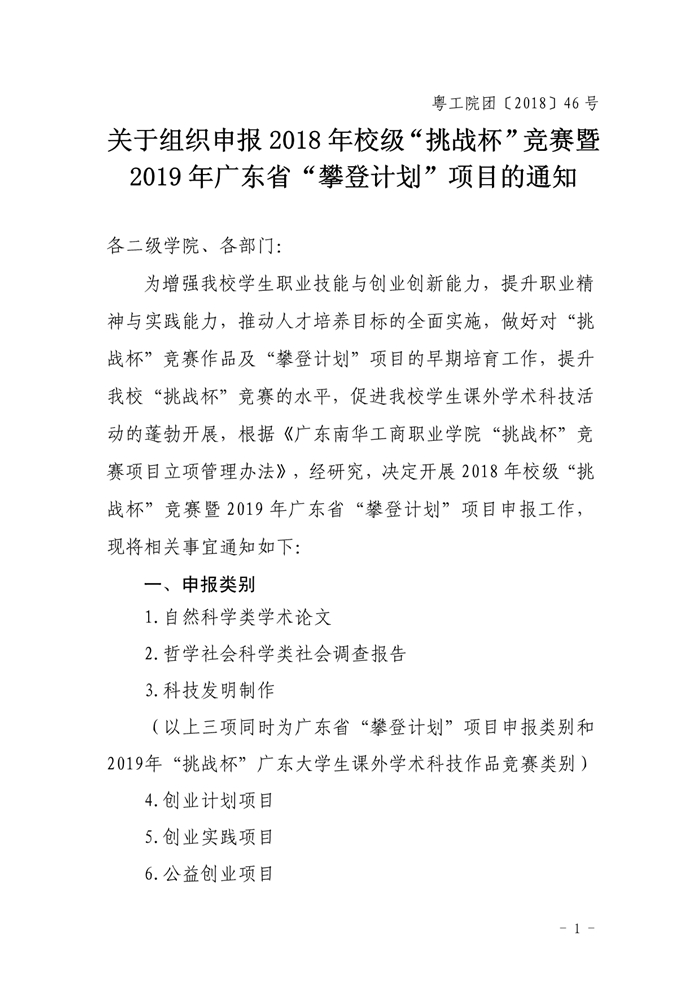 关于组织申报2018年校级“挑战杯”竞赛暨2019年广东省“攀登计划”项目的通知