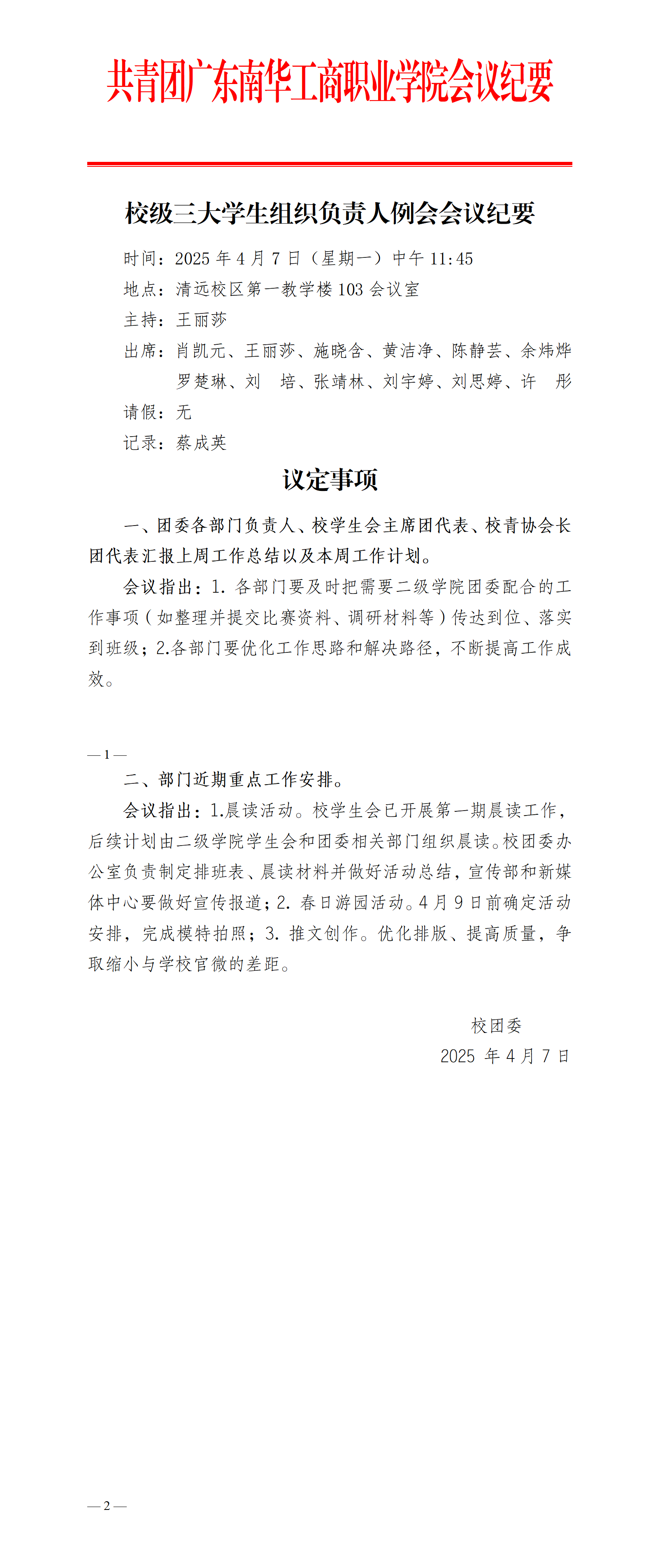 校级三大学生组织负责人例会会议纪要(2025.4.7)
