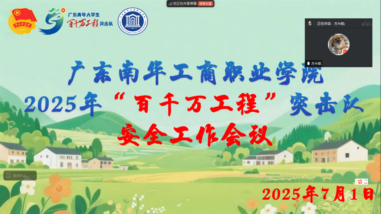 会上,校团委副书记刘晓玲通报了今年百千万工程突击队的整体情况,并重点解读了《广东南华工商职业学院暑期社会实践活动安全工作实施方案》。她表示,各突击队要以“安全为首、预防为主、防管结合”为工作原则,严格执行“队伍—学院—校团委”三级联动安全工作制度,确保行前准备、责任落实、风险保障、知识普及和信息畅通。校团委专职团干张一简要介绍了突击队宣传工作方案,希望各个团队深度融入“劳模赋能”主题,同时注意针对实践地的不同特色进行有针对性的宣传。
