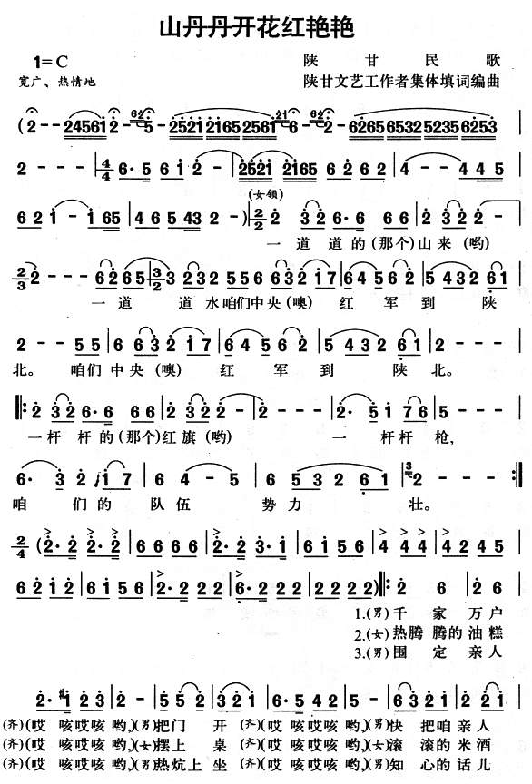 作品采用了陕北民歌“信天游”中嘹亮奔放的高腔演唱,配以极具陕北风味的旋律与叠宇式的歌词,描述了红军长征胜利抵达陕北时,正逢满山的山丹丹花开的美丽情景。快慢对比、富于变化的节奏型和大量的装饰音,共同构成能了最富于陕北特色的旋律。“千家万户(哎嗨哎嗨呦)把门开(哎嗨哎嗨呦),快把咱亲人迎进来。”兴奋的心情伴随着喜庆的锣鼓,陕北民歌的特色衬词“哎嗨哎嗨呦”为军民相逢再平添上一抹欢腾。经历了艰苦长征的红军战士来到陕北,吃上了热饭,穿上了棉衣,开启了新征程。