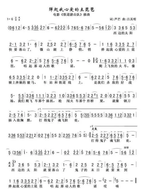 电影《铁道游击队》的插曲《弹起我心爱的土琵琶》,充满了革命的英雄主义与浪漫主义情感。歌曲分为三个部分,以A-B-A结构呈现,开头与结尾遥相呼应。首尾两段以拍的抒情旋律,展现出游击队员们淳朴真挚的感情。中间段以吴拍的快节奏,生动形象地描绘出游击队员在铁道上勇敢作战的英雄气魄。诗人芦芒、何彬的填词简洁有力,形象鲜明,再现了铁道游击队员的矫健身影:“就像钢刀插入敌胸膛,打得鬼子魂飞胆丧。”曲作者吕其明将气韵悠长的山东民歌与附点八分音符的节奏型巧妙结合,使游击队员们朴实敦厚的性格和灵活机动的英姿都表现得栩栩如生。