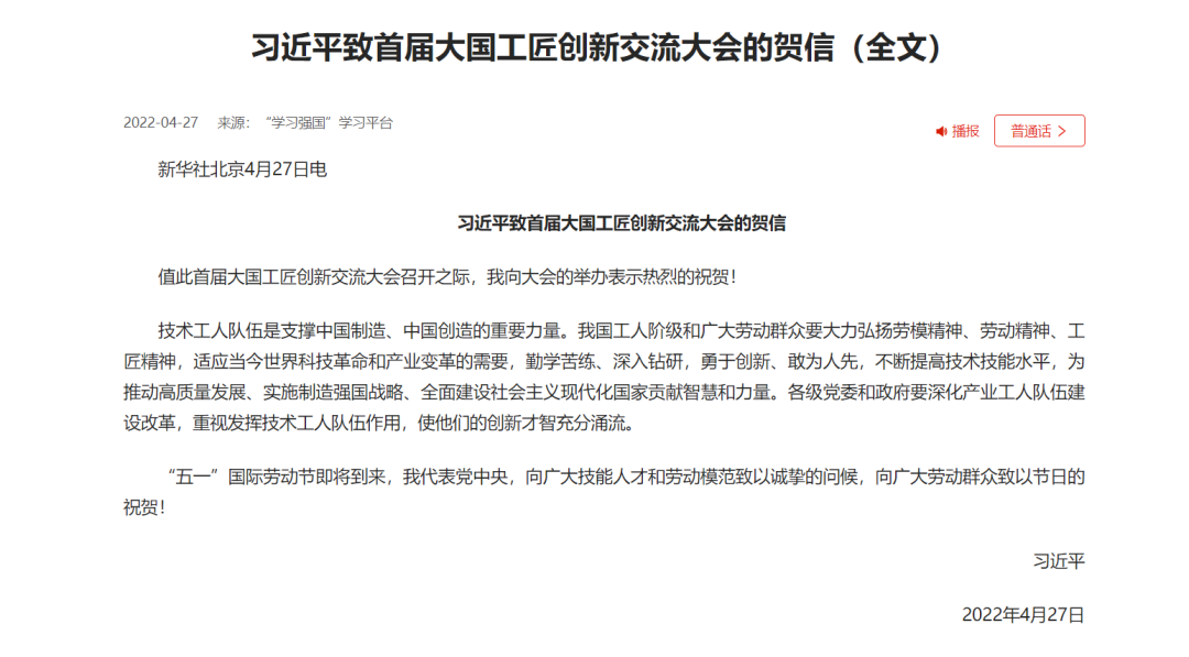 习近平致首届大国工匠创新交流大会的贺信(全文)