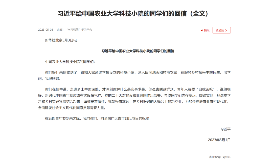 习近平总书记给中国农业大学科技小院的同学们的回信(全文)