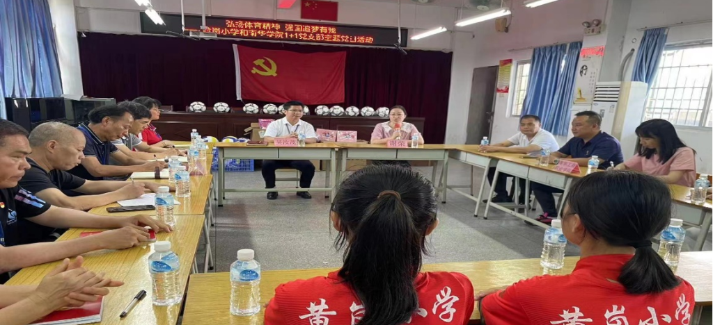 借此次活动契机,双方党支部就学校的体育特色活动及如何开展“冠军精神引领”工作的进行了沟通和交流。黄岗小学足球队刚刚获得肇庆(四会)市“市长”杯小学组足球冠军,吴汝茂校长为大家介绍了该校足球整体文化建设构架,历数学校如何开展校园足球建设,分享了近几年来取得的成绩,双方党员一起现场观摩了该校学校足球特色大课间活动的训练情况。