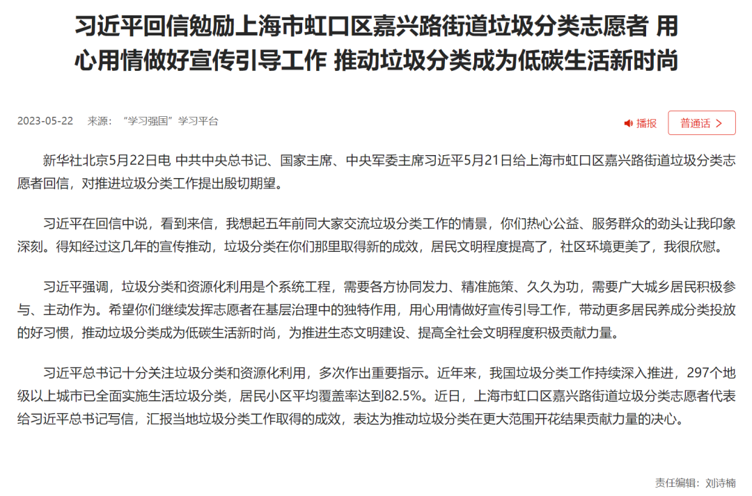 习近平回信勉励上海市虹口区嘉兴路街道垃圾分类志愿者(新闻稿)