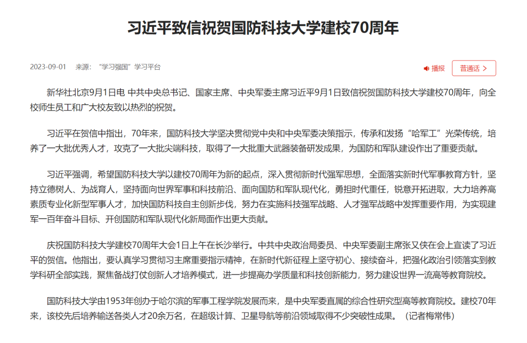 习近平总书记致信祝贺国防科技大学建校70周年(新闻稿)