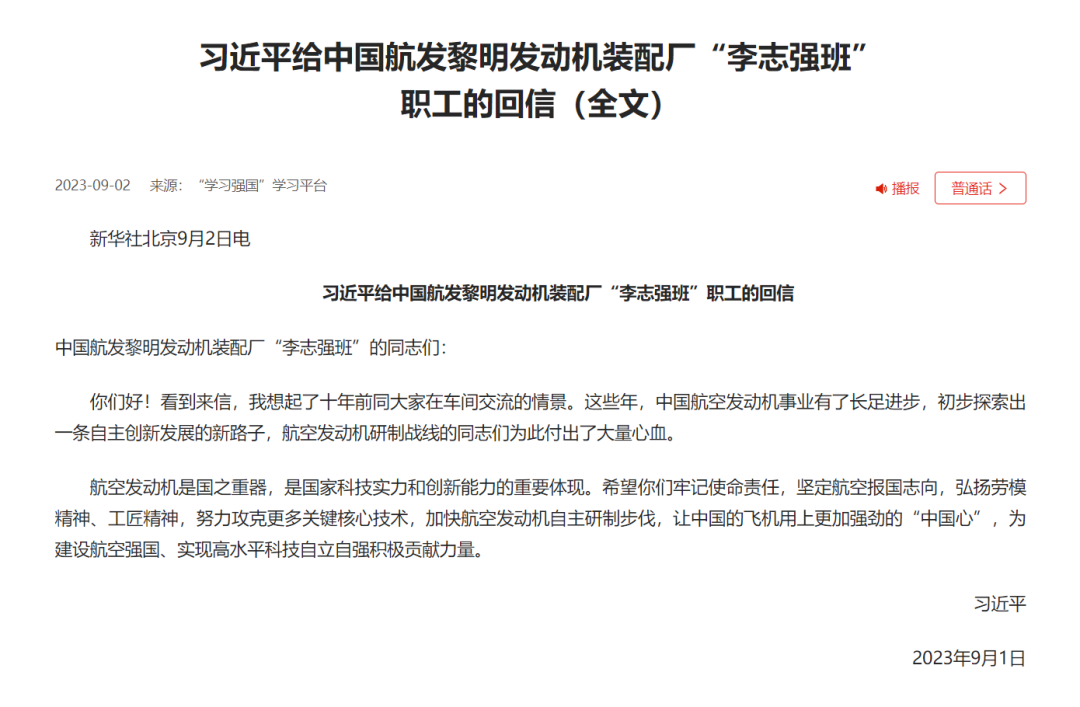 习近平给中国航发黎明发动机装配厂“李志强班”职工的回信(全文)