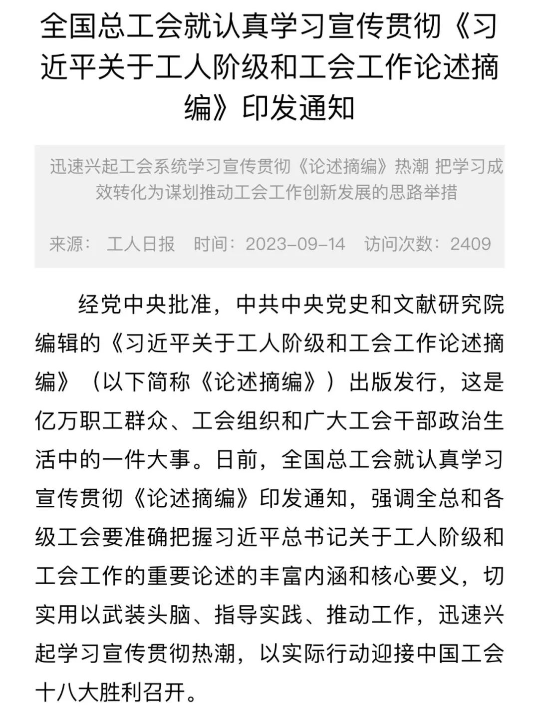 全国总工会认真学习宣传贯彻《习近平关于工人阶级和工会工作论述摘编》通知精神(新闻稿)
