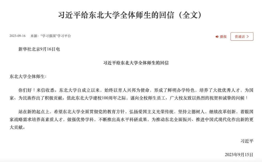 习近平总书记给东北大学全体师生的回信(全文)