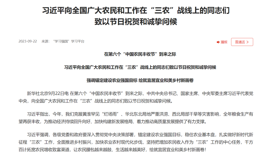 2.习近平总书记向全国广大农民和工作在“三农”战线上的同志们致以节日祝贺和诚挚问候(新闻稿)