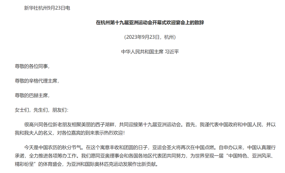 1.习近平总书记在杭州第十九届亚洲运动会开幕式欢迎宴会上的致辞(全文)