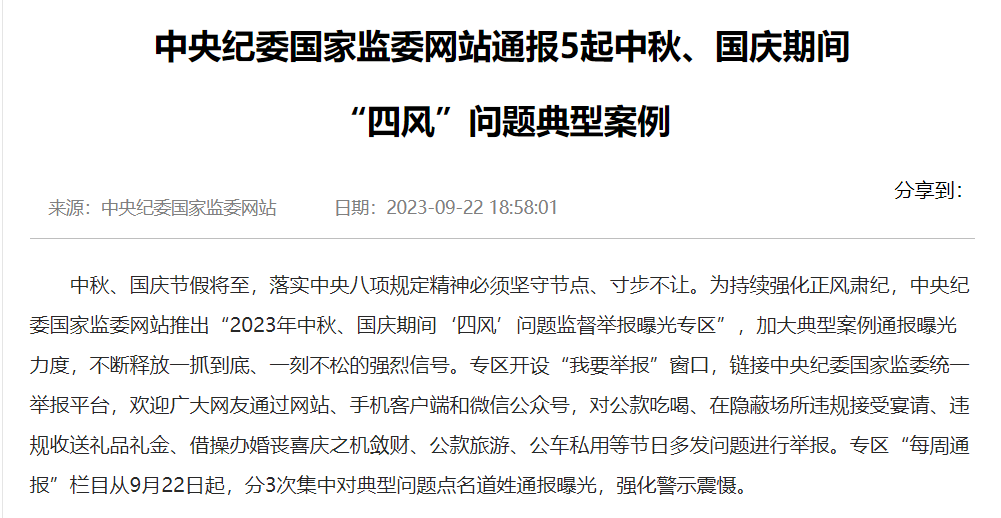 3.中央纪委国家监委网站通报5起中秋、国庆期间“四风”问题典型案例