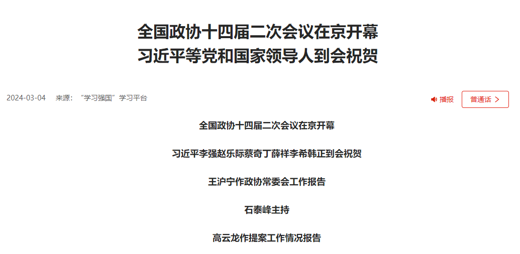 1.全国政协十四届二次会议在京开幕 习近平等党和国家领导人到会祝贺(新闻稿)。