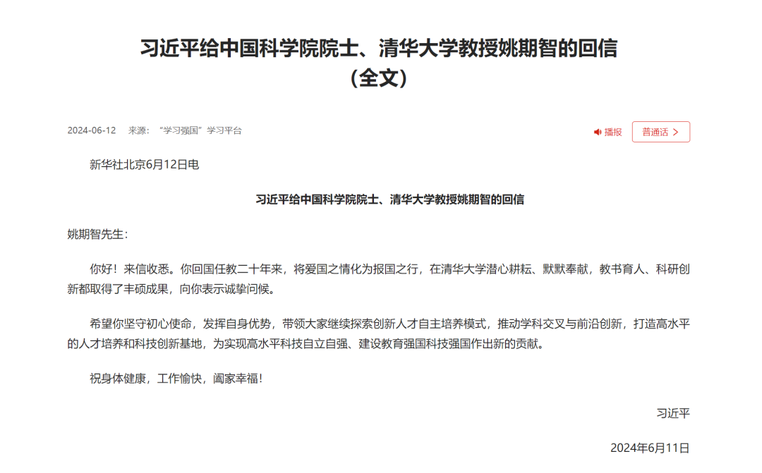1.习近平总书记给中国科学院院士、清华大学教授姚期智的回信(全文)。