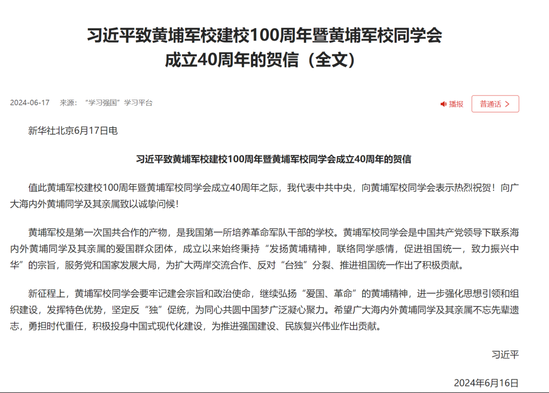 2.习近平总书记致黄埔军校建校100周年暨黄埔军校同学会成立40周年的贺信(全文)。