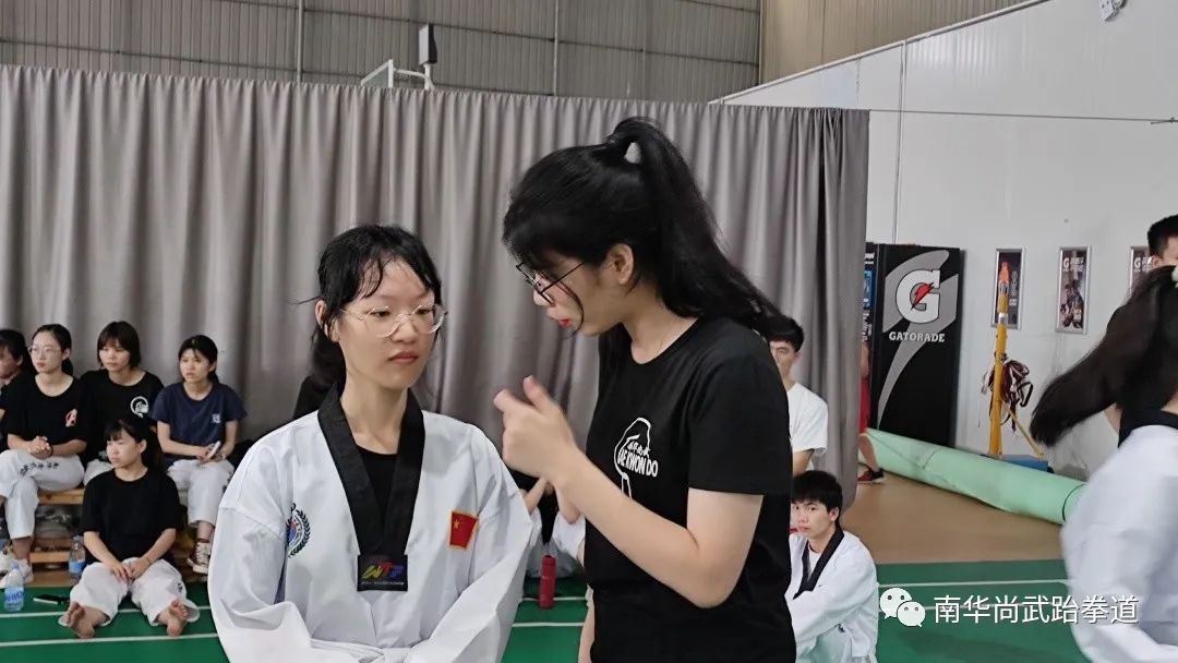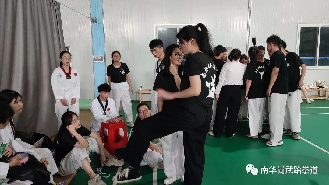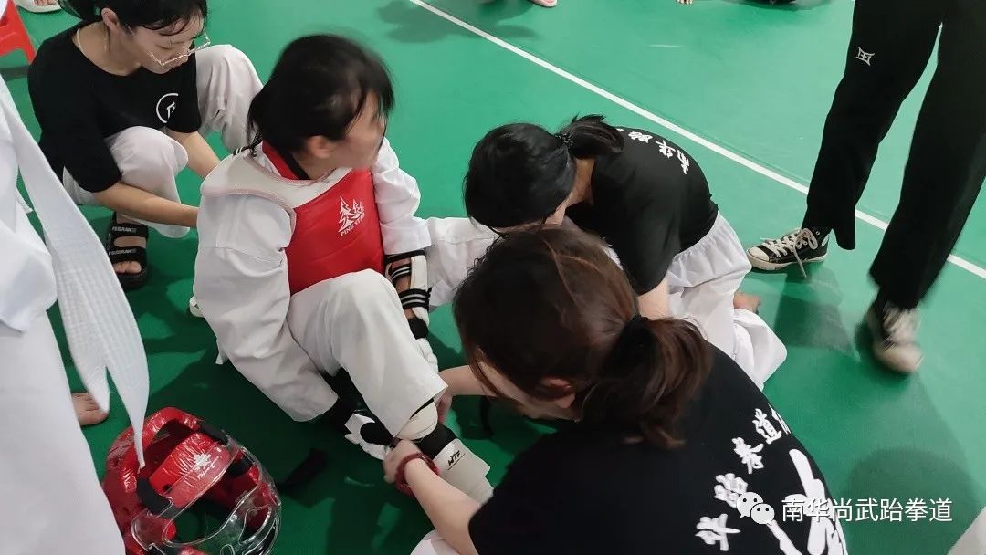 这次比赛,也体现了我们尚武跆拳道团队合作的精神,每次当参赛人员上场之前,我们的社长卓小艺都会在比赛前讲述战术策略,下场后每个人都为队员脱护甲,护膝,及时为人员散热,恢复体力。