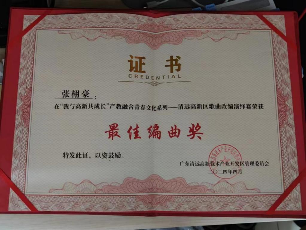 4月13日,“我与高新共成长”歌曲改编与演绎比赛正式落下帷幕。本次活动分为歌曲改编与歌曲演绎两个赛道,由清远市音乐家协会专家组成评审组,对来自省职教城10所高校16组选手的作品进行评审。经过激烈的角逐,由我校体艺部张含老师指导的22级国商班张栩豪同学在比赛中脱颖而出,荣获最佳编曲奖。