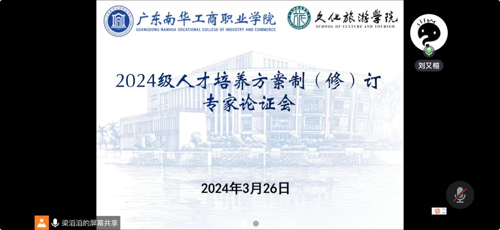 为进一步提升文化旅游学院专业人才培养方案的修订质量,强化专业建设高质量发展,加强人才培养方案的科学性与实用性,文化旅游学院于2024年3月26日19:30在腾讯会议线上召开了 2024 级酒店管理与数字化运营专业群专业人才培养方案专家论证会。会议由文化旅游学院副院长梁滔滔主持,邀请广州沐辰教育咨询有限公司总经理潘家佳、东莞市伯顿饮食服务有限公司合伙人陈国凤、广东省民宿发展研究院执行院长徐灵枝、广东机电职业技术学院外语商务学院副院长及教授王宁、广东科学技术职业学院旅游学院专业负责人及副教授段金梅进行人才培养方案的讨论论证,文化旅游学院副院长谭金凤、院长助理陈晓华、酒店管理与数字化运营专业群负责人和各专业负责人参加了论证会。