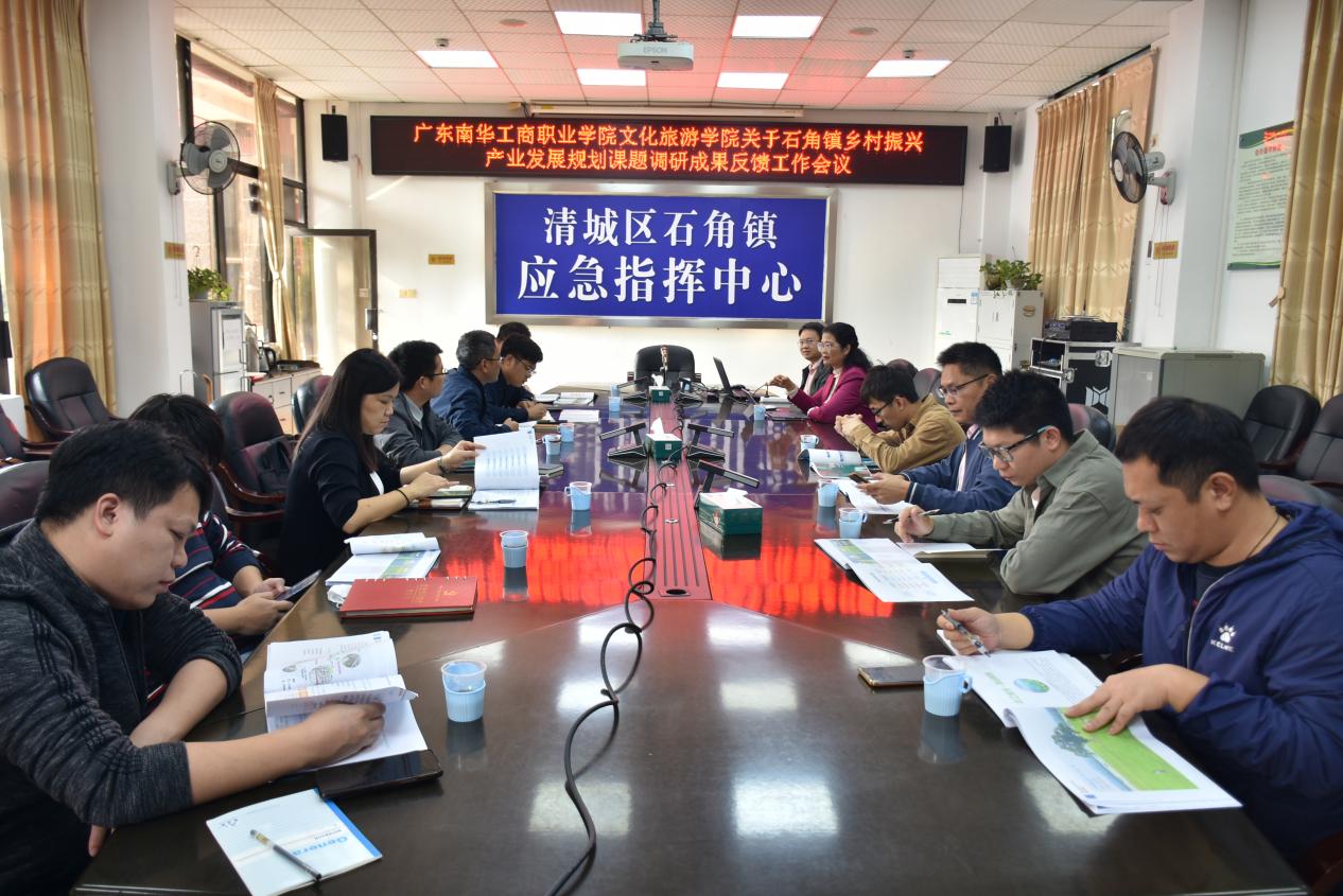 文化旅游学院秉承服务区域经济宗旨,凭借专业优势为清远地区乡村振兴发展赋能。副院长谭金凤于2023年8月立项清远市科学技术协会第一批智库课题《石角镇乡村振兴产业发展规划(2023-2027)》。项目团队经过深入调研,认真撰写了规划成果报告,并于11月23日在石角镇人民政府二楼会议室参加石角镇政府组织的“广东南华工商职业学院文化旅游学院关于石角镇乡村振兴发展规划课题调研成果反馈工作会议”。镇长钟文思、清城区委办挂职党委副书记李传胜、副镇长曾铖和林雪霞、乡村振兴办公室主任钟小文,以及石角镇其他职能部门负责人共11人出席汇报会。