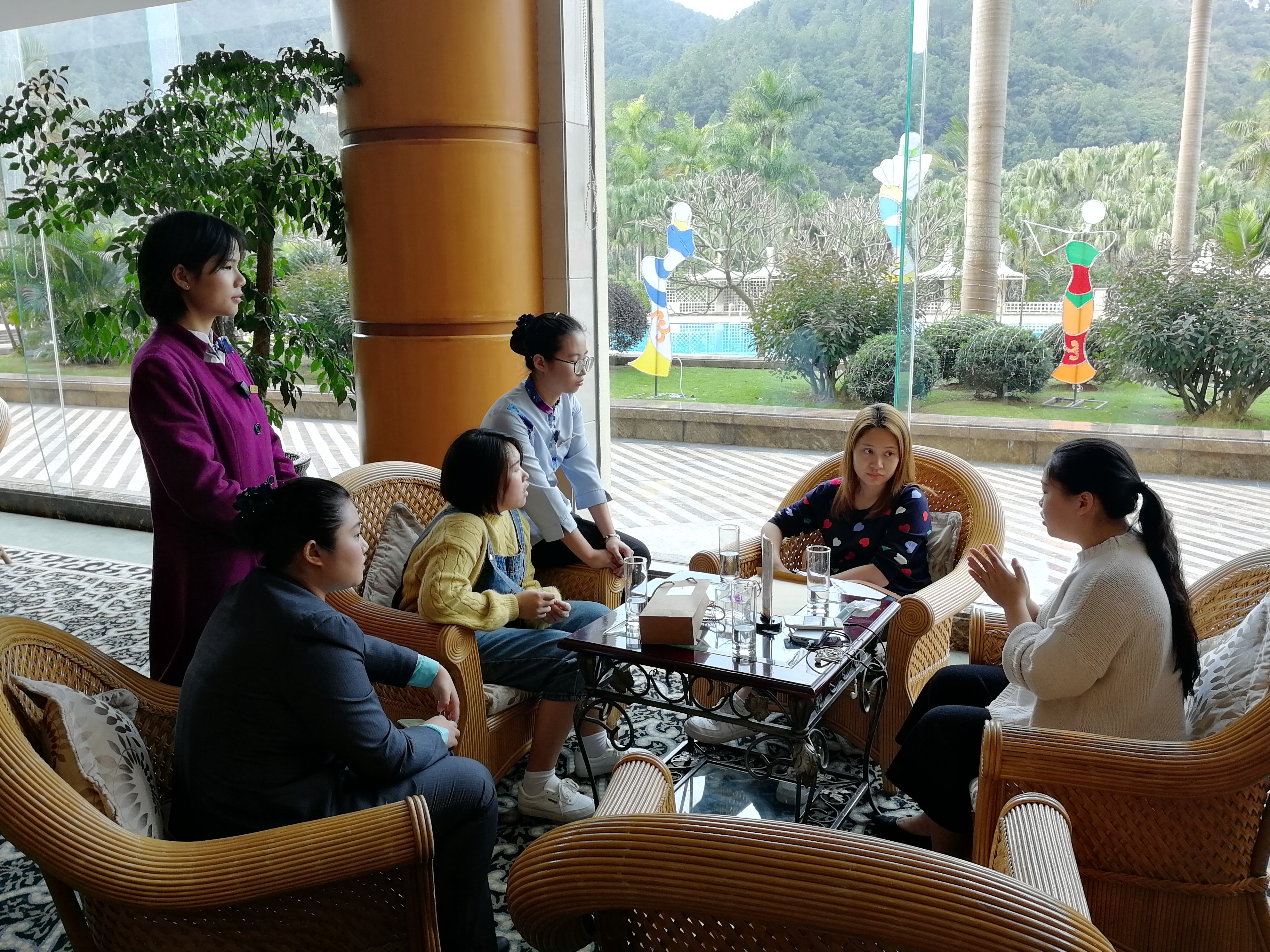 2016级碧水湾班学生分布在前厅、客房、餐饮、温泉等多个部门一线岗位。两位老师实地到岗,和同学们展开了深入的交流。同学们纷纷将实习中遇到的困惑、发展的目标和收获与体会等进行了分享,表示要学会吃苦、顶住物质精神压力、用心对待工作,最终能发现所有工作都可以成为个人能力的组成部分。黄隽老师针对同学们提出的关于就业途径等问题进行了一对一的解答;关惠贞老师从职业发展的角度,结合了当今行业发展的趋势,给予了同学们指导。